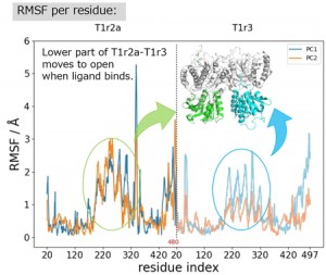 <Abstract:> Molecular dynamics simulations were performed on the ligand-bound taste receptor proteins T1r2a-T1r3, followed by principal component analysis (PCA). PCA confirmed that ligand binding induces opening and closing motion of the lower part of the protein (the part closer to the cell membrane), with significant movement particularly in T1r3. The free energy landscape revealed features of metastable states reflecting this movement. These results suggest that the movement of T1r3 induced by ligand binding may play an important role in triggering signal transmission to the transmembrane region of the taste receptor.