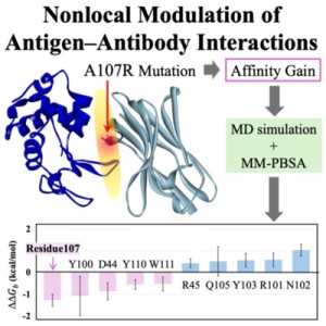 <Abstract:> Single-domain VHH antibodies offer attractive developability, but rational affinity improvement requires atomistic insight into how sequence changes reshape binding. We investigated the A107R substitution in VHH D2-L29 bound to hen egg-white lysozyme using long-timescale molecular dynamics simulations with MM-PBSA based thermodynamic analysis. Computed binding free energies recapitulated the experimentally observed increase in affinity. Per-residue decomposition of the change in binding free energy indicated that residue 107 (A107R) and Tyr100 had the largest favorable changes, whereas Asn102 had the largest unfavorable change. Together, the results indicate that molecularly detailed, interface-wide analysis of nonlocal interaction changes is essential for rationally engineering VHH variants with enhanced affinity.