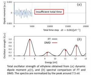 <Abstract:> Optical spectrum prediction based on first-principles calculations is important for the development of optical materials. In particular, Time Dependent Density Functional Theory (TDDFT) in real-time is one of the most widely used calculation methods. In real-time TDDFT, the dynamic dipole moment is used to obtain the polarizability by Fourier transform (FT). The optical spectrum can be obtained from this polarizability. However, if the time length is not sufficient, the spectrum resolution depends on the length and becomes ambiguous. To solve this problem, we introduced Dynamic Mode Decomposition (DMD). This spectral analysis technique uses both Singular Value Decomposition and Proper Orthogonal Decomposition to obtain frequencies and intensities of spectrum. The signal frequency and the intensity are directly obtained. This method was applied to TDDFT time series data for ethylene and small molecules of benzene, naphthalene, anthracene, and tetracene. Compared to conventional FT, clear spectra were obtained from a short time series data.